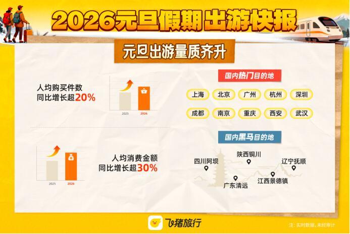 飞猪数据显示,元旦假期,四川旅游预订量同比去年增长超3倍,其中门票预订量同比去年增长约4倍,成都入选全国热门城市,阿坝增速排名靠前。从省内来看,成都、阿坝、绵阳、乐山、南充成为全省热门目的地,阿坝、资阳、自贡增速最快。