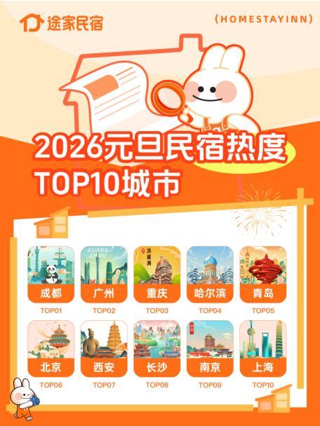 无论是换个城市旅行,朋友聚会还是家庭度假,在多元的跨年场景中,民宿凭借空间弹性强、场景适配度高的特点,成为承载节日情绪与生活方式的重要空间。途家民宿大数据显示,2026年元旦假期,平台热门城市的民宿订单量同比去年增长1.6倍。民宿订单最多的城市为成都、广州和重庆;“00后”的民宿订单量占比近7成。