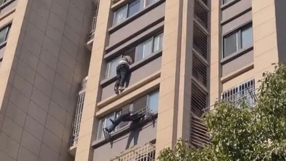 视频显示,一名老人仰面被困在一处高楼窗台外的晾衣架上,一名男子身绑白色带子,从楼上爬下踩在窗台,将老人救回屋内。视频发布者称,事发南京市浦口区亚东滨江和园小区。