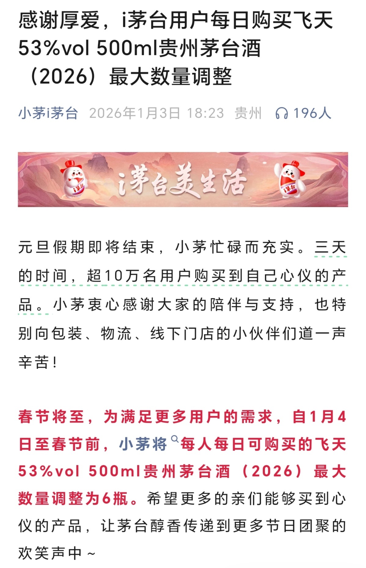 此前,贵州茅台曾发布消息,自2026年1月1日起,飞天53%vol 500ml贵州茅台酒(以下简称飞天茅台)将于“i茅台”平台上架开售,每人每日可购买12瓶。官方数据显示,1月1日—1月3日,已有超10万名用户购买到自己心仪的产品。