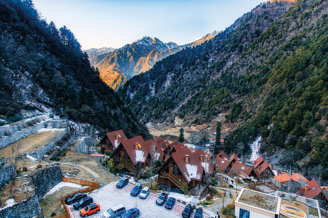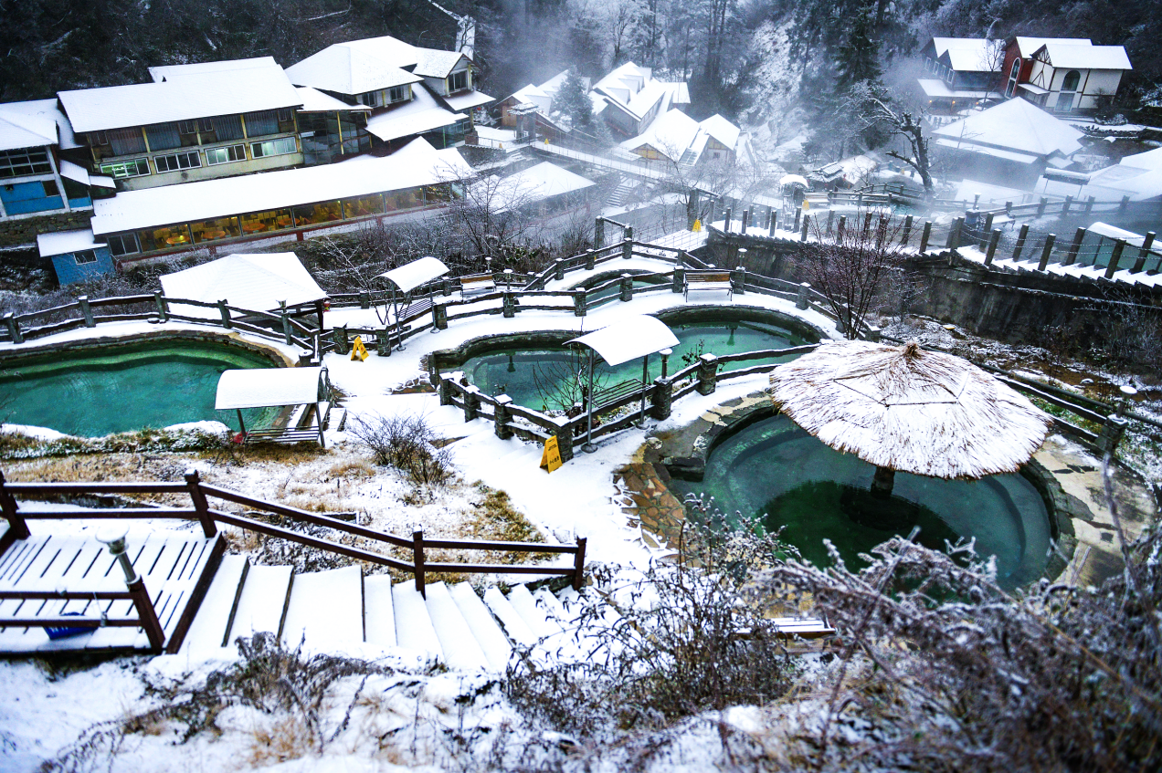 镇上酒店遍布温泉池,坐落于温泉路33号的华美达温泉酒店,面对霸王雪山依山而建,拥抱万亩彩林红叶,酒店主楼隐于密林,推窗即雪山与森林的对话。高山无边界温泉泳池是酒店亮点,高度差450米,让池水仿佛与天际相连:远处苍茫雪峰,近处翠山环抱,泡在温泉中,热气蒸腾,眺望秋冬红叶或雪景,宛如童话世界。独栋花田木屋更添异国情调,像瑞士小镇里的小屋,木香扑鼻,独居其间,夜听溪水,晨观朝霞。