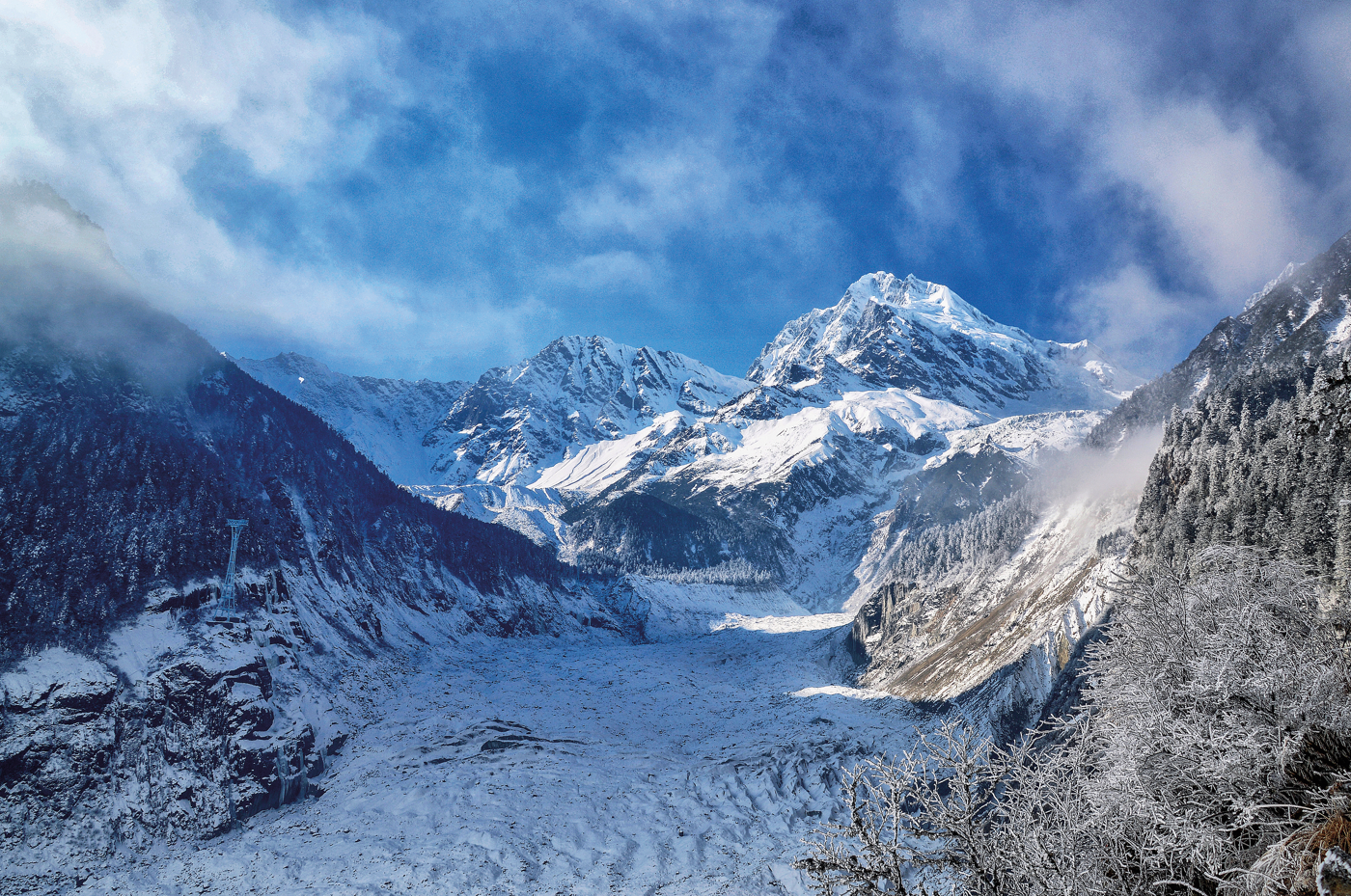 走进海螺沟,你会被那条绵延14.7千米的“一号冰川”震撼:它宽达500至1100米,从海拔6750米的最高点坠落至2850米的最低点,落差近3900米,覆盖16平方千米的冰面如一条银色巨龙,蜿蜒盘踞在崇山峻岭间。站在冰川脚下,寒风拂面,巨大的冰壁反射着阳光,发出蓝盈盈的光芒,那种大自然的雄伟力量,仿佛能直击灵魂深处,让你不由自主地屏息凝视。