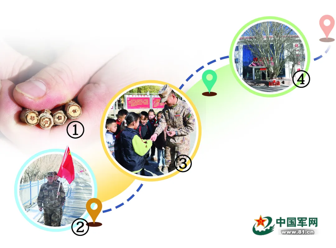 图①:迈丹边防连战士展示“五星杨”树枝横截面。褚晨阳 摄