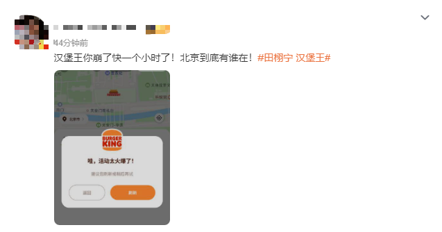 1月4日上午10:00,汉堡王因代言人、演员田栩宁的元旦礼盒上线,大量粉丝涌入导致汉堡王小程序和APP短时间内崩溃,用户无法访问或下单。