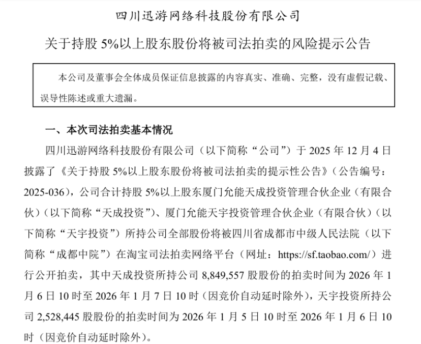 近日,被誉为“四川互联网第一股”的四川迅游网络科技股份有限公司(下称“迅游科技”,300467)再曝股东股份拍卖动态,公司合计持股5%以上股东厦门允能天成投资管理合伙企业(有限合伙)(下称“天成投资”)、厦门允能天宇投资管理合伙企业(有限合伙)(下称“天宇投资”)所持公司合计1137.80万股股份(起拍总价约1.55亿元),将被四川省成都市中级人民法院于2026年1月初在淘宝司法拍卖网络平台进行公开拍卖。