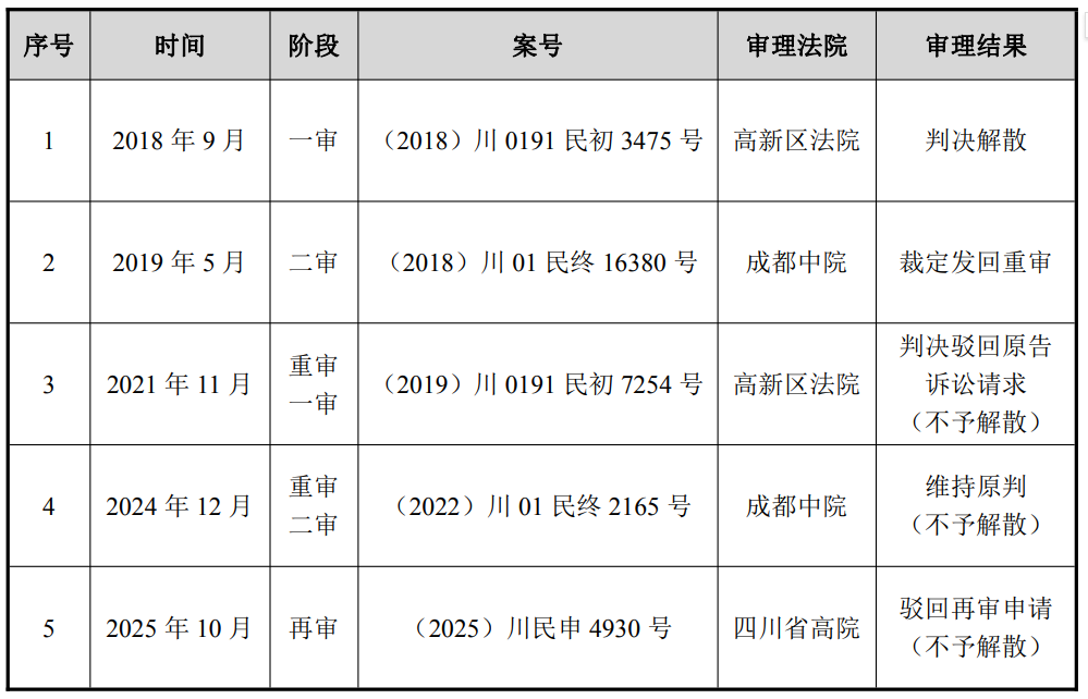 这场法律拉锯战历时近8年,历经一审、上诉、发回重审、再上诉直至再审。2025年10月,四川省高级人民法院最终裁定驳回莫晓宇等4人的再审申请,维持国腾电子集团不予解散的原判。