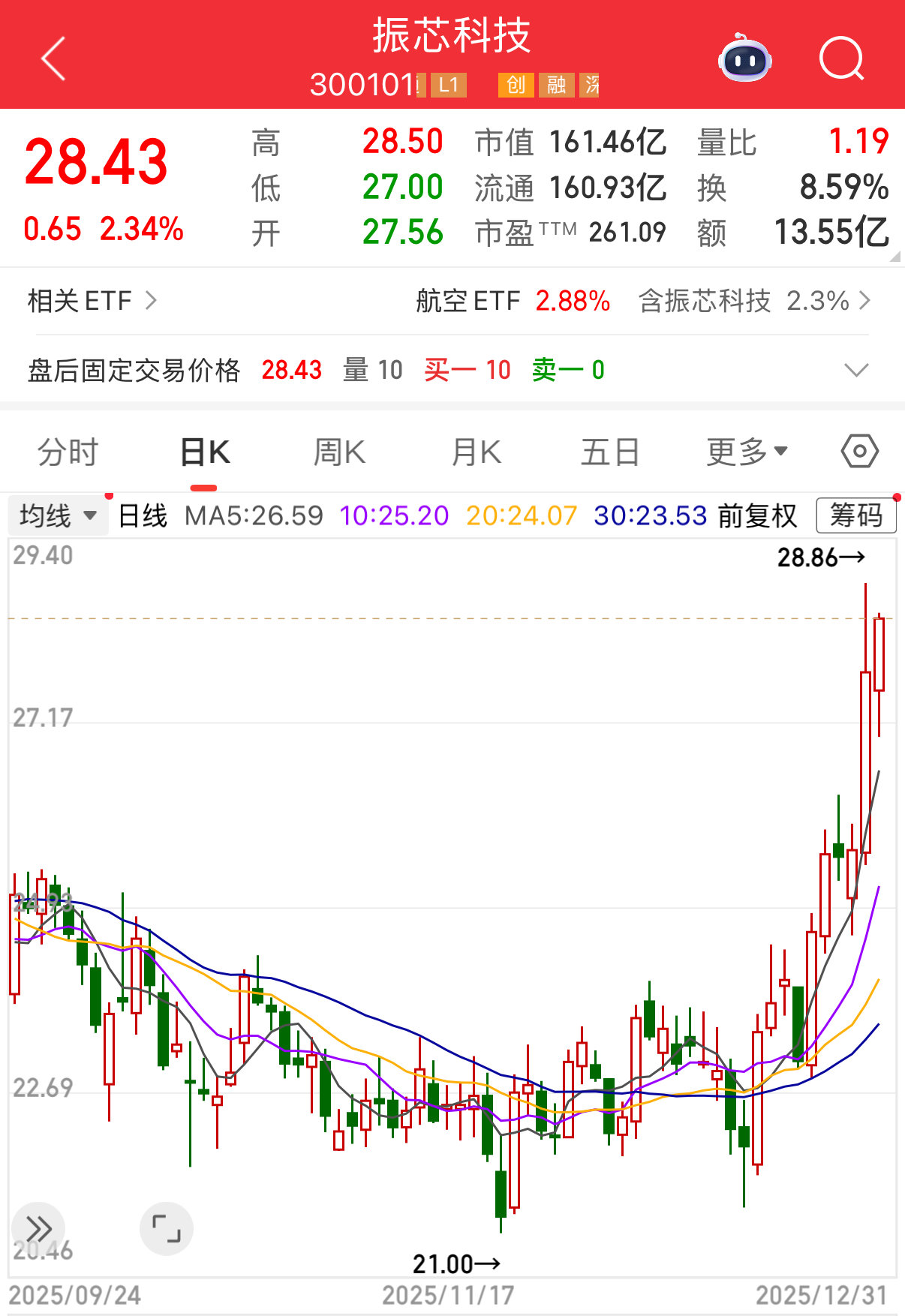二级市场方面,截至2025年12月31日,振芯科技报28.43元/股,总市值161.46亿元。
