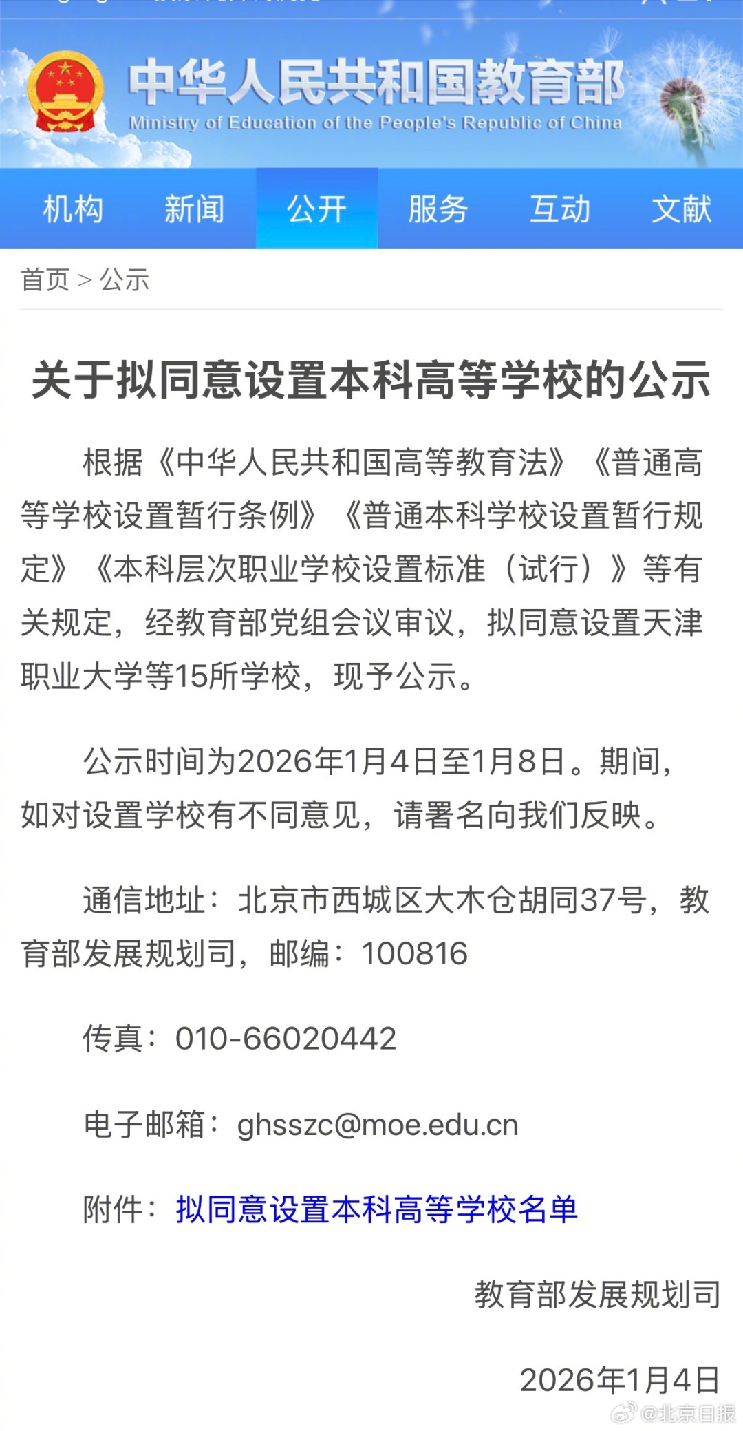教育部官网显示,1月4日教育部发布关于拟同意设置本科高等学校的公示: