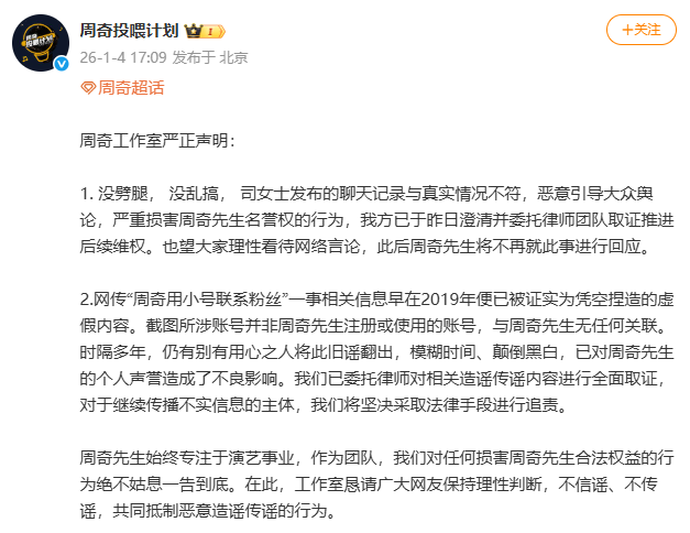 周奇工作室于当日9点21发布声明,定性司晓迪言论为“不实言论”,严重侵害艺人合法权益;已委托律师团队完成取证,将采取法律手段追责,强调“对任何触犯法律的行为绝不姑息”;呼吁公众“不信谣、不传谣”,抵制损害他人权益的行为,维护健康网络环境。