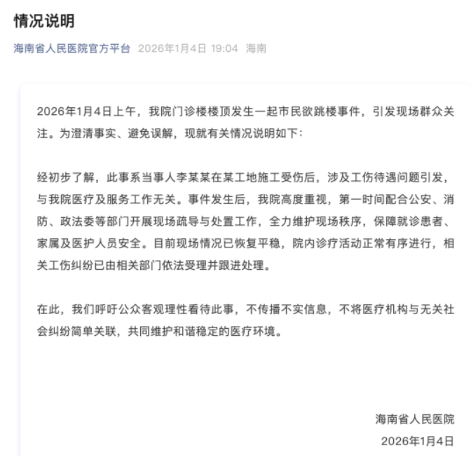 2026年1月4日上午,我院门诊楼楼顶发生一起市民欲跳楼事件,引发现场群众关注。为澄清事实、避免误解,现就有关情况说明如下:
