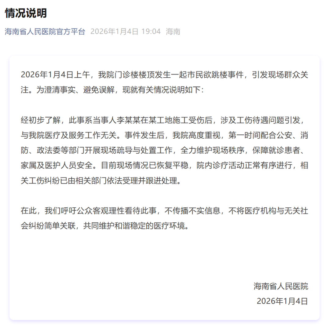 2026年1月4日上午,我院门诊楼楼顶发生一起市民欲跳楼事件,引发现场群众关注。为澄清事实、避免误解,现就有关情况说明如下: