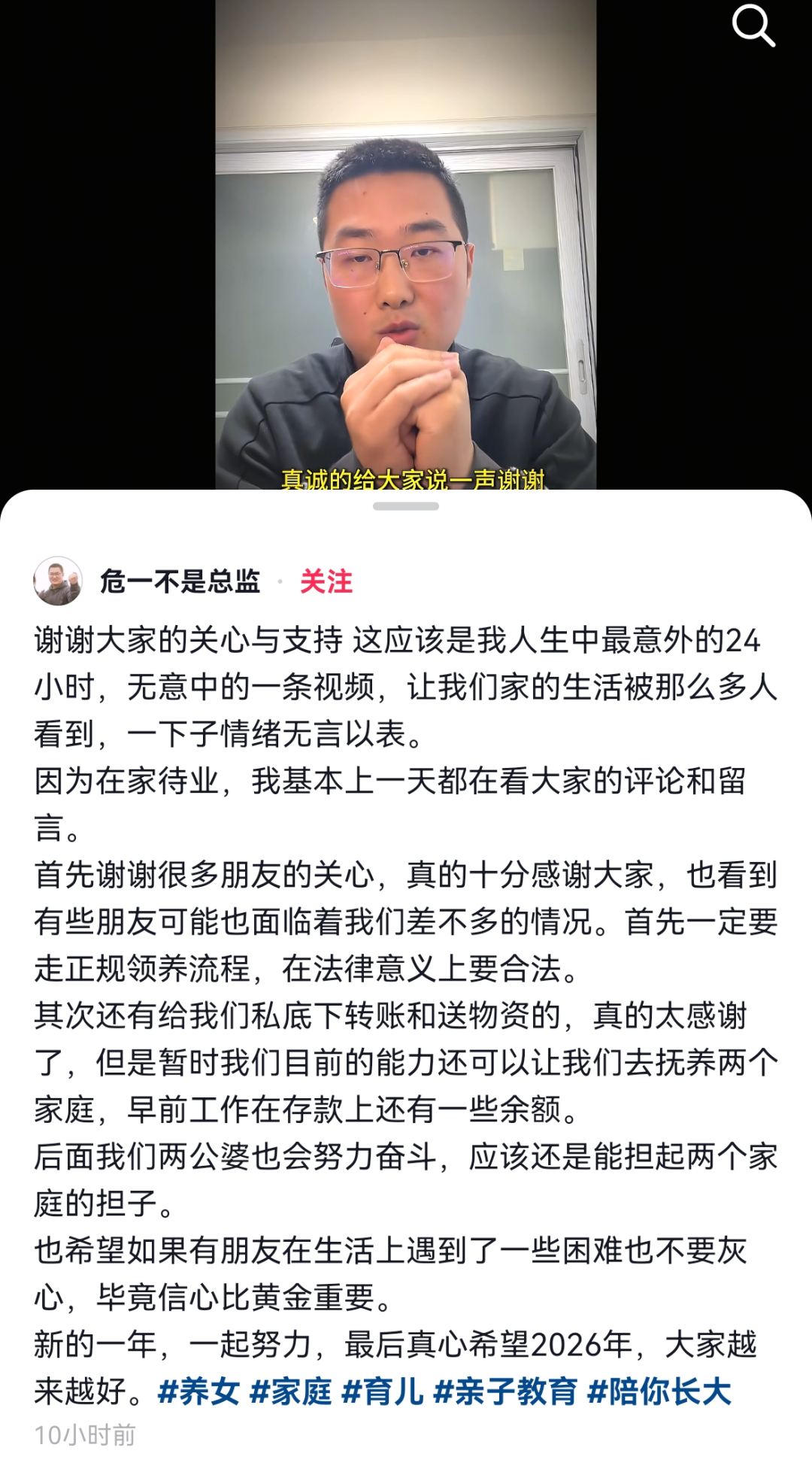 1月2日,危一发布的这条“没想到我成为别人的第二爸爸”的视频,引爆网络。危一对记者说,从来没想过自己的视频会火。有网友质疑他是否用其起号,危一回应自己没有起号的概念,也不懂运营,只是把这个经历做分享。也有网友想要帮助他们一家人,被他拒绝了。对于目前的计划,危一更希望能多多赚钱养家糊口。对外甥女的付出源于夫妻相互扶持,妻子为家里付出了很多。因此她家里遇到了难处,自己没有袖手旁观的道理。