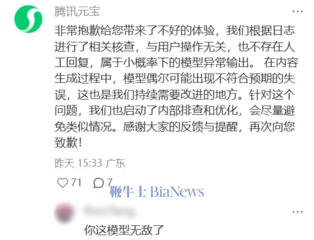 对此,腾讯元宝在评论区回复:非常抱歉给您带来了不好的体验,我们根据日志进行了相关核查,与用户操作无关,也不存在人工回复,属于小概率下的模型异常输出。