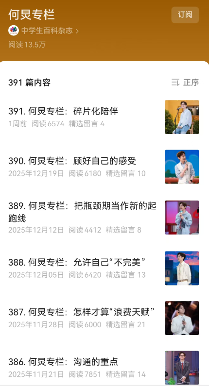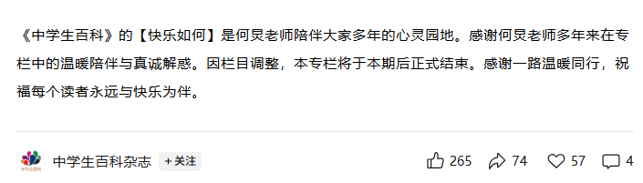 近日,“中学生百科杂志”公众号宣布何炅专栏停止更新:感谢何炅老师多年来在专栏中的温暖陪伴与真诚解惑。因栏目调整,本专栏将于本期后正式结束。感谢一路温暖同行,祝福每个读者永远与快乐为伴。