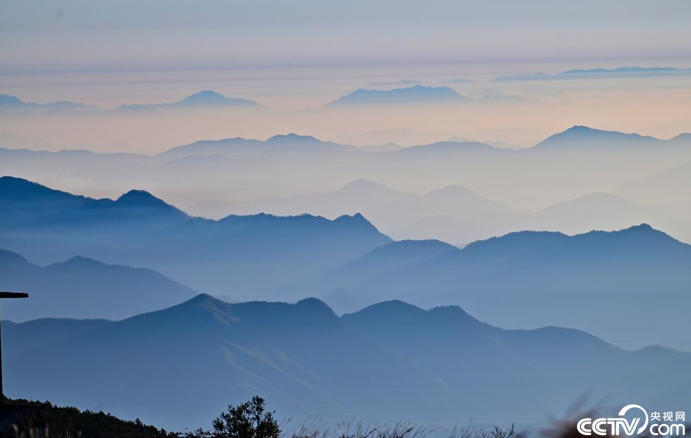在江西省上饶市铅山县黄冈山顶,远眺连绵山脉犹如千里江山图。