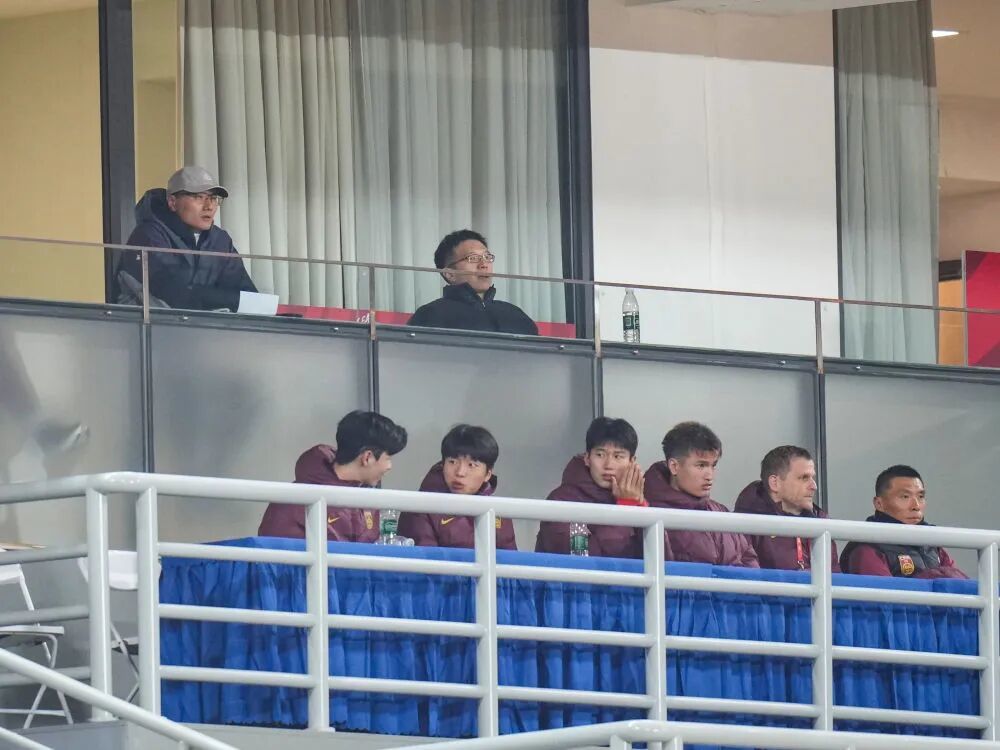 2025年11月18日,中国男足国家队主教练邵佳一(上排左)在2025CFA中国之队·熊猫杯国际足球锦标赛中观赛。新华社记者 王曦 摄