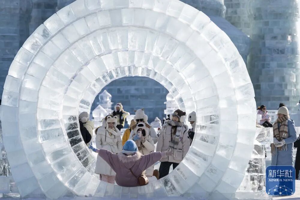 1月2日,人们在哈尔滨冰雪大世界园区拍照。新华社记者 张涛 摄