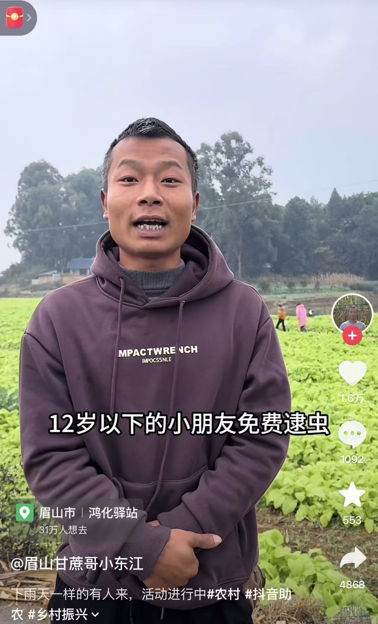继“偷甘蔗”活动火爆全网后,四川眉山“甘蔗哥”童鹏飞又在自家农场里玩出新花样。元旦假期,他推出“抓虫换萝卜”亲子活动:12岁以下儿童捉满5条菜青虫即可免费兑换一根萝卜,12岁以上游客花10元购买袋子即可进地随意拔萝卜。现场热闹非凡,被网友称为现实版“保卫萝卜”。