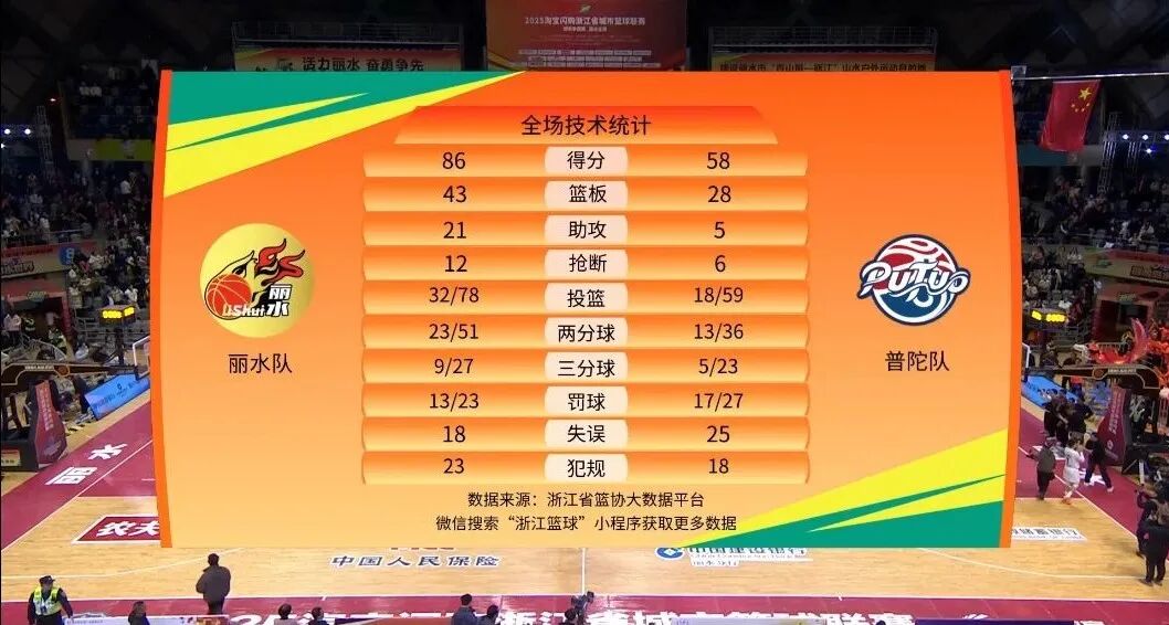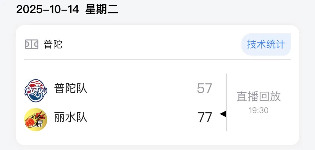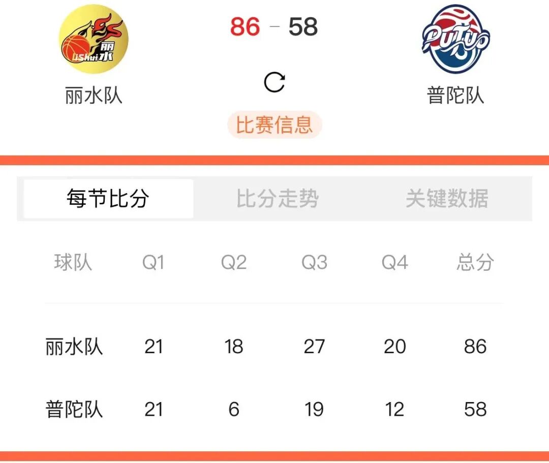 本场比赛后,丽水队的战绩为15胜4负积34分,普陀队的战绩为3胜16负积22分。比赛精彩瞬间↓