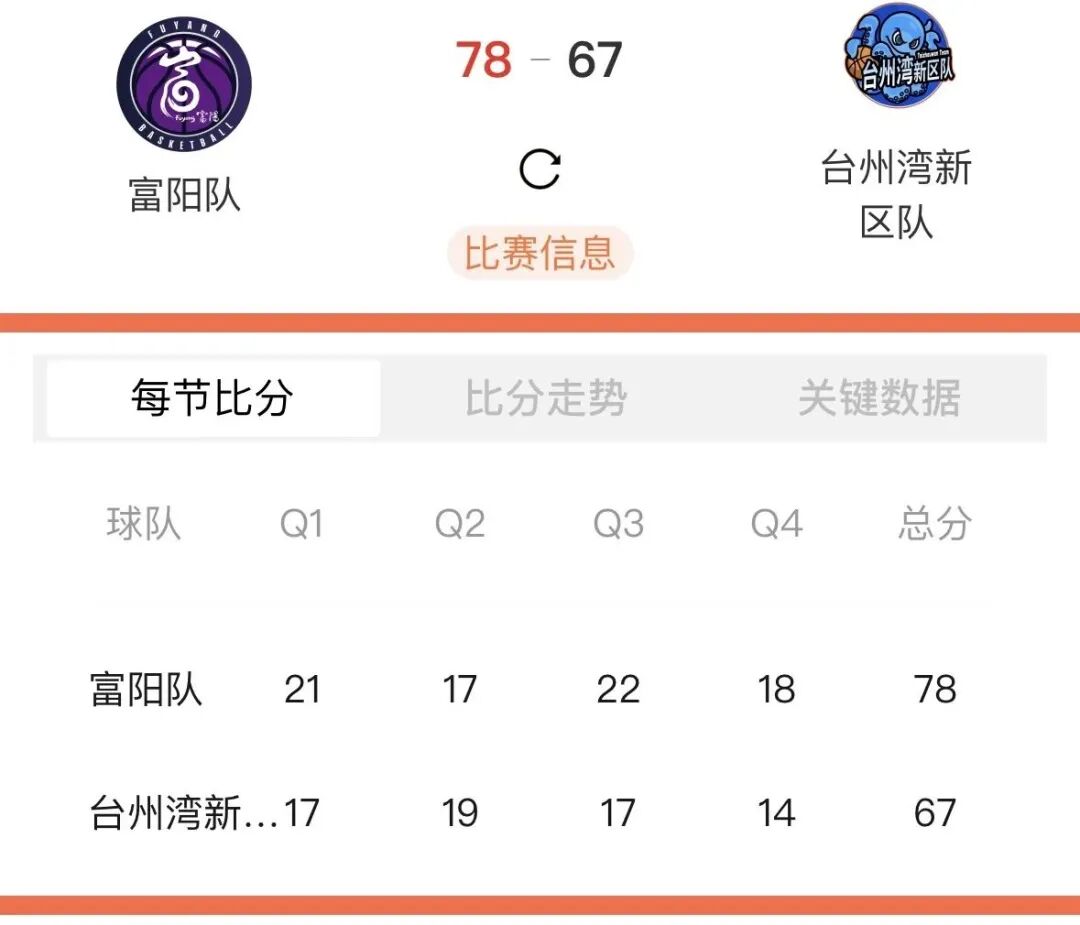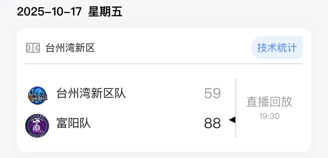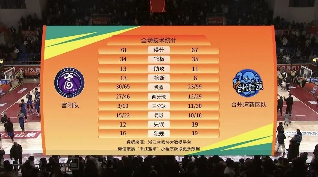 本场比赛后,富阳队的战绩为17胜2负积36分,台州湾新区队的战绩为3胜16负积22分。比赛精彩瞬间↓
