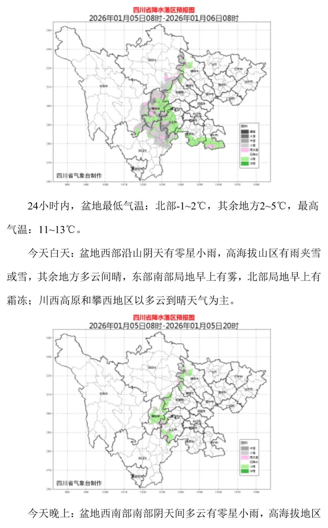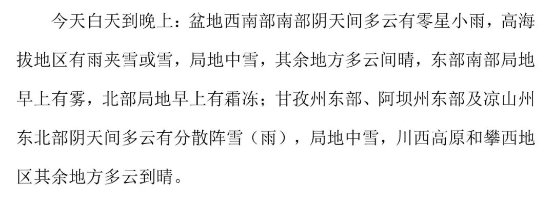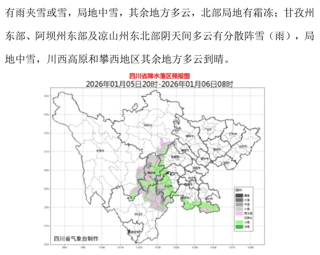 1月4日,记者从四川省气象台了解到,未来3天,四川盆地西部、南部沿山阴天有零星小雨,高海拔山区有雨夹雪或雪,其余地方以多云天气为主。川西高原东部、北部和凉山州东北部多分散阵雪(雨),局地有中到大雪,需防范雨雪冰冻天气对交通、重大工程施工等带来的不利影响。川西高原和攀西地区其余地方以多云到晴天气为主,午后风力较大,森林草原火险气象等级较高,需加强火源管理和森林防火工作。