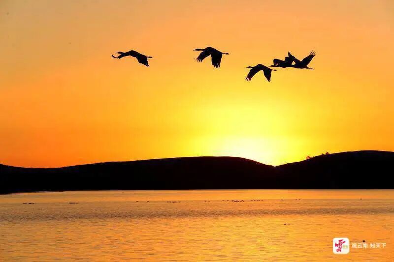 小寒时节,在大山包黑颈鹤国家级自然保护区,黑颈鹤迎着朝阳盘旋飞舞。张广玉 摄