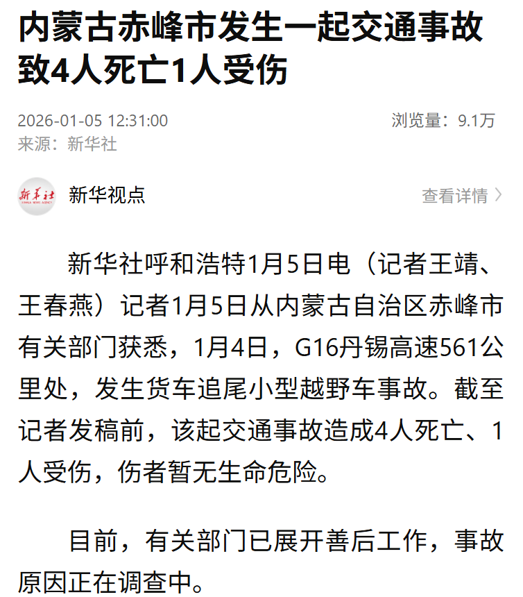 新华社记者1月5日从内蒙古自治区赤峰市有关部门获悉,1月4日,G16丹锡高速561公里处,发生货车追尾小型越野车事故。截至记者发稿前,该起交通事故造成4人死亡、1人受伤,伤者暂无生命危险。