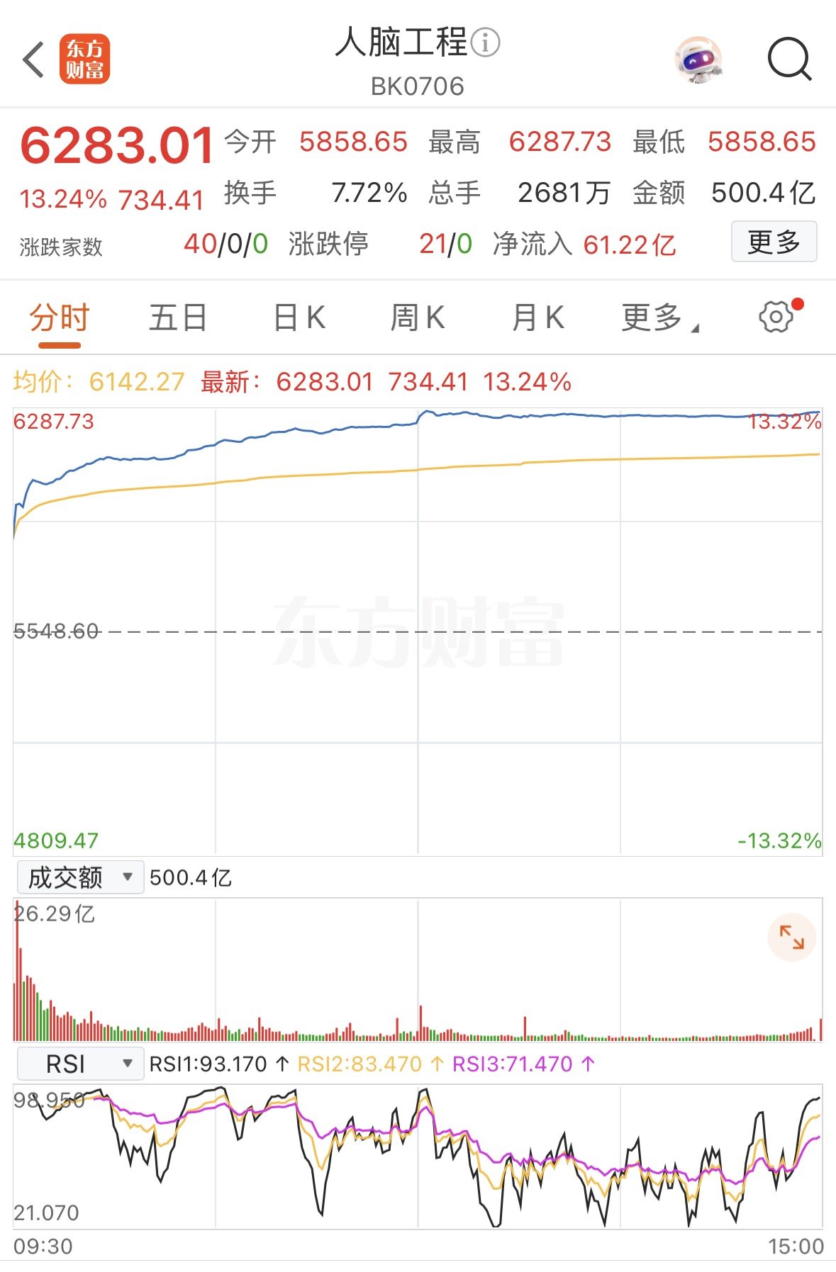 据东方财富数据,在474个细分板块中,跌幅居前的免税概念、退税商店两大赛道跌幅均超1%,其余板块跌幅则控制在1%以内,整体回调幅度有限。而领涨阵营表现则亮眼得多——人脑工程板块单日涨幅高达13.24%,成为今日市场最核心的上涨引擎。