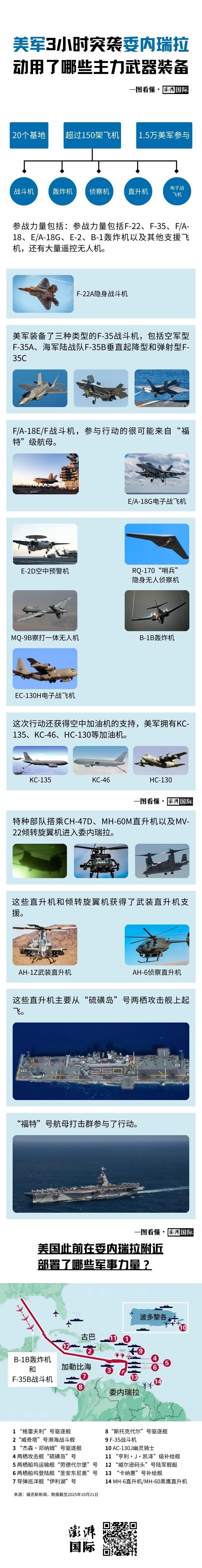 根据美军公布的信息,行动开始后,超过150架飞机从美军西半球海上和陆地20个基地起飞,包括轰炸机、战斗机、侦察机、旋翼机等。执行强行控制马杜罗任务的直升机在飞行过程中,以约30米的高度贴着海面飞行,大约1.5万美军参与了此次行动。参战力量包括F-22、F-35、F/A-18、E/A-18G、E-2、B-1轰炸机以及其他支援飞机,还有大量遥控无人机。