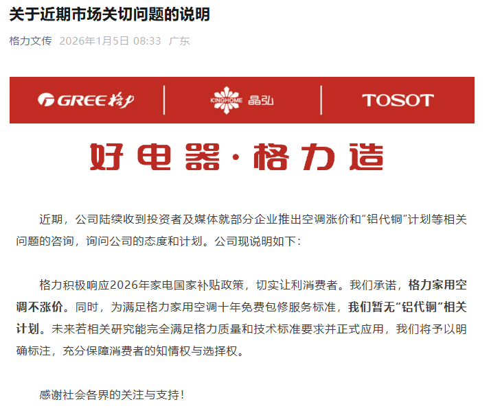 格力表示,公司承诺,格力家用空调不涨价。同时,为满足格力家用空调十年免费包修服务标准,公司暂无“铝代铜”相关计划。未来若相关研究能完全满足格力质量和技术标准要求并正式应用,将予以明确标注。