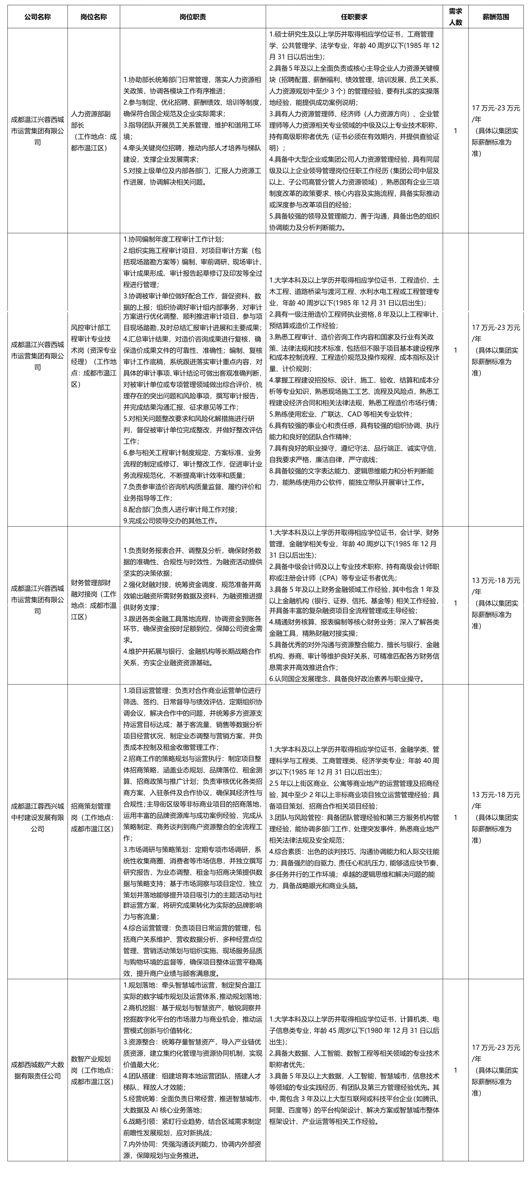 招聘企业:成都温江兴蓉西城市运营集团有限公司