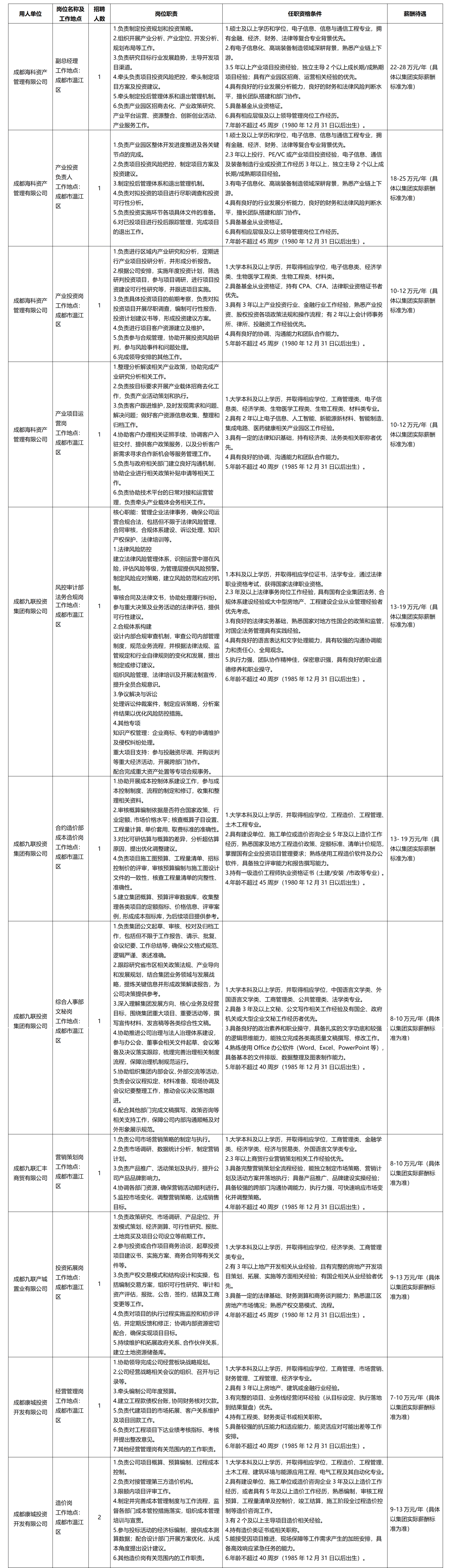 招聘企业:成都九联投资集团有限公司