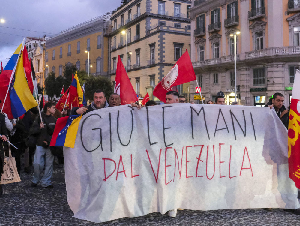 1月3日,在意大利那不勒斯,当地民众手持写有反对干涉委内瑞拉内容的标语参加抗议活动。新华社发