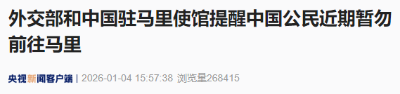 外交部和中国驻马里使馆提醒中国公民近期暂勿前往马里,已在当地中国公民和机构请尽快撤离或转移至巴马科、焦伊拉、库提亚拉、桑等相对安全区域,密切关注局势发展,保持高度警惕,加强安全防范和应急准备,确保人身安全。如遇紧急情况,请及时报警并与使馆联系寻求协助。执意前往或驻留人员将面临极高人身安全风险,并影响获得协助的时效。