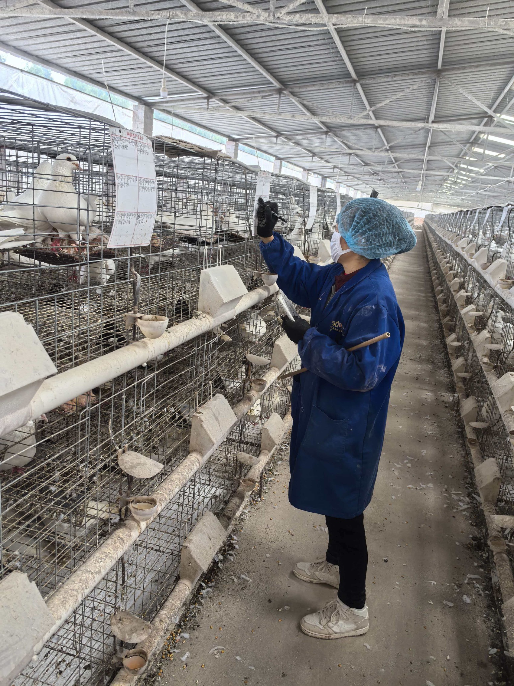 养殖场内,工人们戴着口罩,熟练地进行饲料投喂、鸽蛋收集、雏鸽调整和鸽舍清洁等工作。