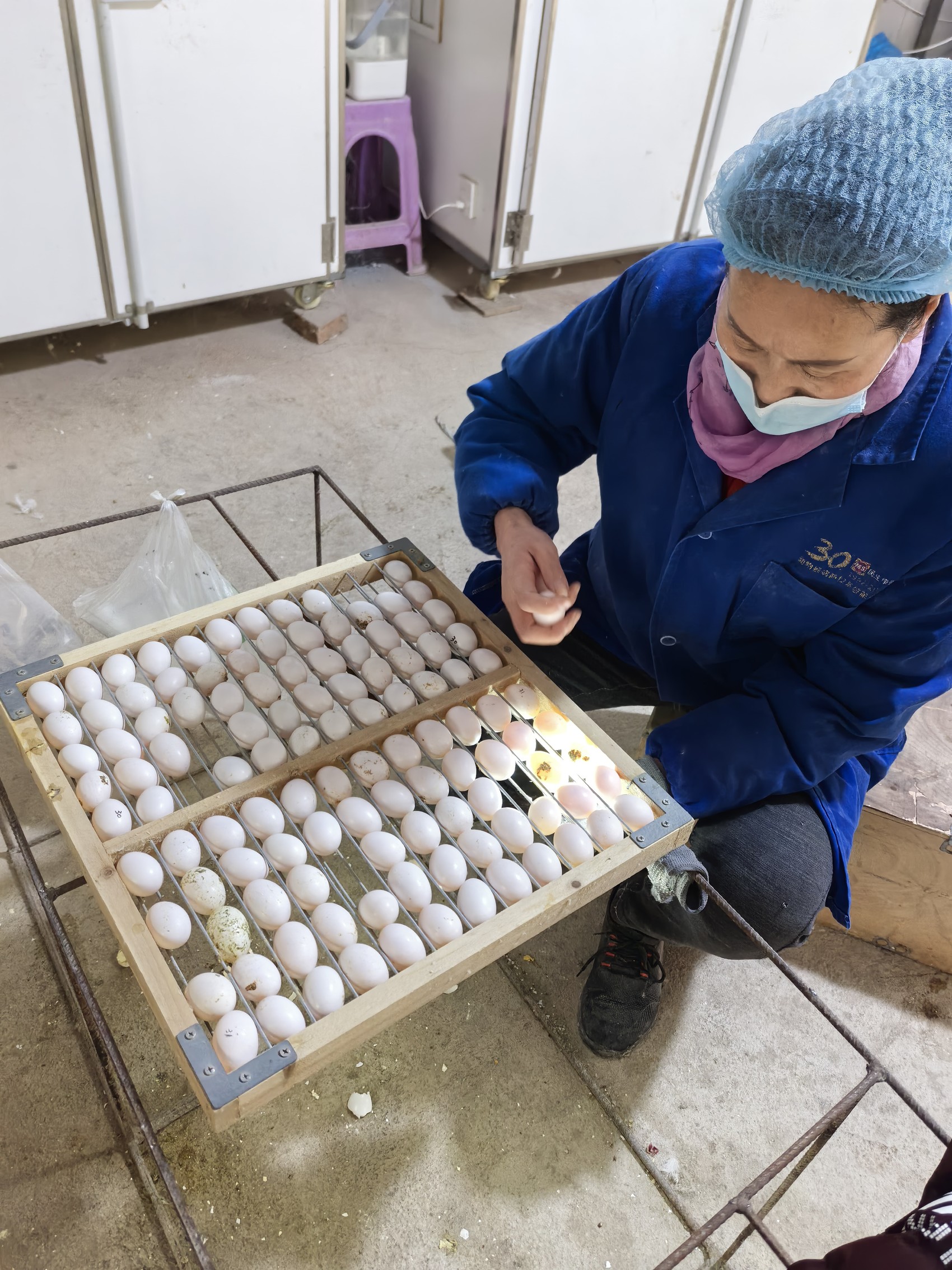 养殖场工人在查看种蛋受精情况。受访者供图