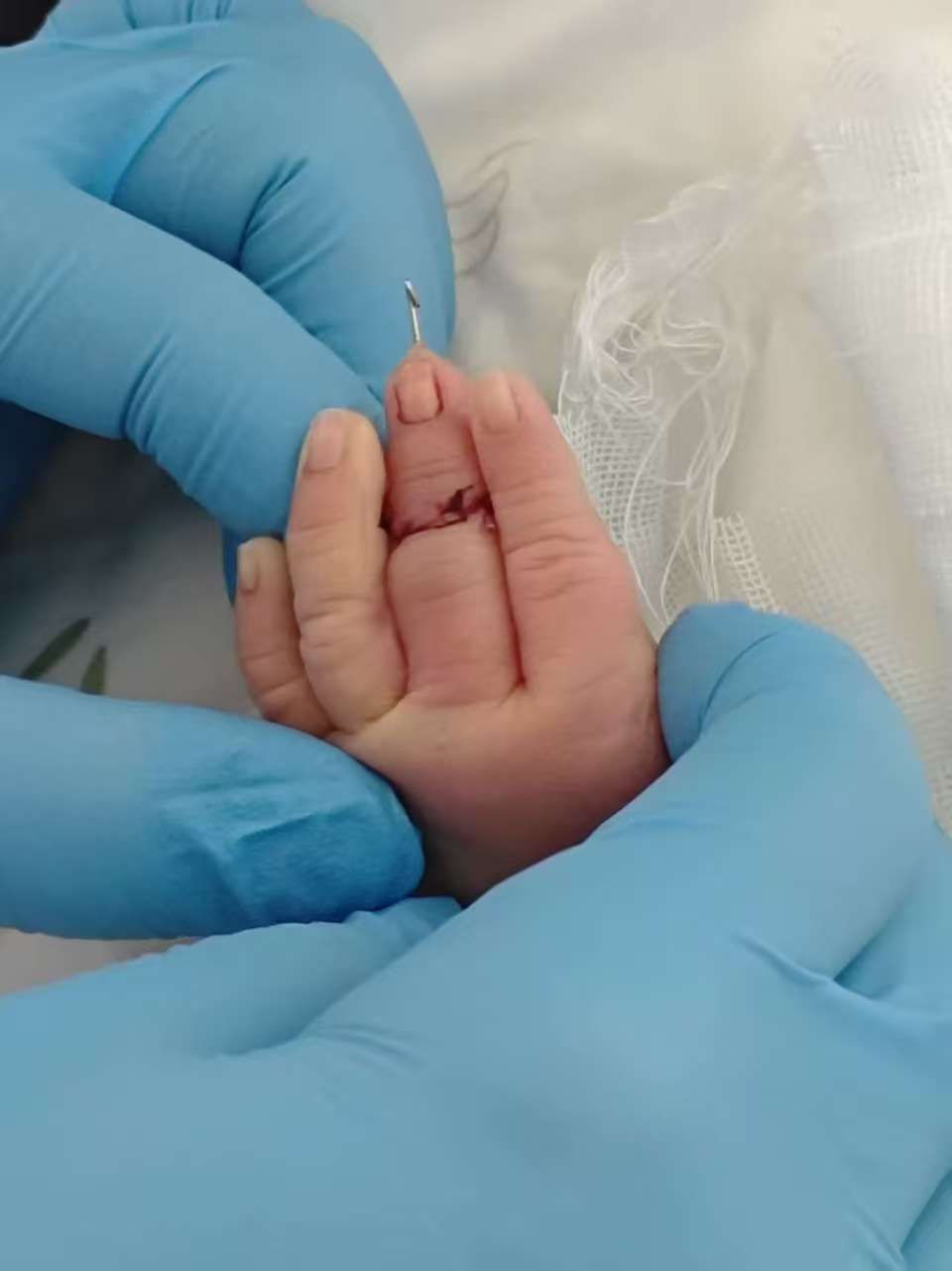 据盛先生介绍,2025年12月25日9时30分许,妻子在盱眙县人民医院接受剖宫产手术,10时30分孩子顺利出生。当日12时左右,医生告知他:孩子左手中指被脐带剪剪断。涉事助产士给出的解释是“孩子的手突然乱动”所致。对此,盛先生无法接受:“这么大的医院,怎么会犯这么低级的错误?”