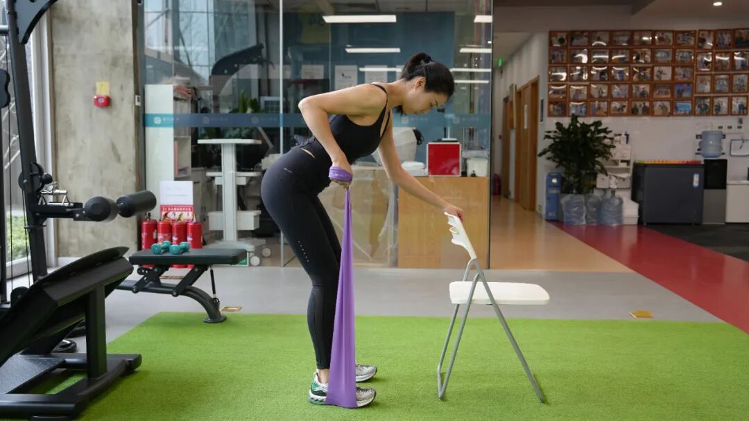 动作要领:用双脚把阻力带的一端固定在地板上,另一端握在手中。臂略微弯曲,躯干向前弯曲,同时用一只手扶住椅子。握住阻力带的手臂自然垂下,开始呼气,用力将阻力带推向身体,吸气并恢复到起始姿势。