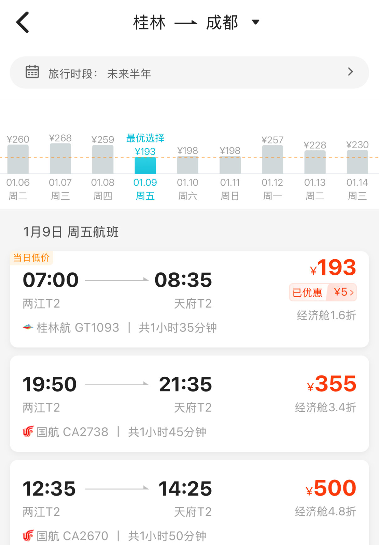 记者梳理发现,未来近一个月内,从成都出发的多条航线票价低至1—2折,包括至桂林、恩施、丽江、杭州、大理、西安、深圳、上海、贵阳、合肥、沈阳、拉萨等20多个城市。与此同时,从这些城市返回成都的直飞航班,大部分票价也处于低位,同样有1—2折的优惠。例如,从桂林、丽江、大理、恩施、上海、合肥、杭州、西双版纳到成都的最低票价在200元左右,从西安、深圳、贵阳、扬州到成都的最低票价在300元左右,从呼和浩特、鄂尔多斯到成都的最低价格在350元左右。而从沈阳到成都的机票折扣约3折,最低价格在600元左右,但该线路较长,直飞时间超4小时;从拉萨到成都的机票最低折扣4折,最低票价超1100元,该航线属于热门航线,目前拉萨直飞成都每天有超10个航班。