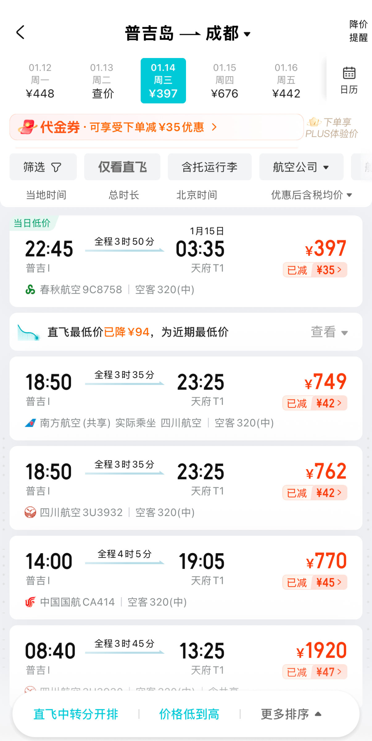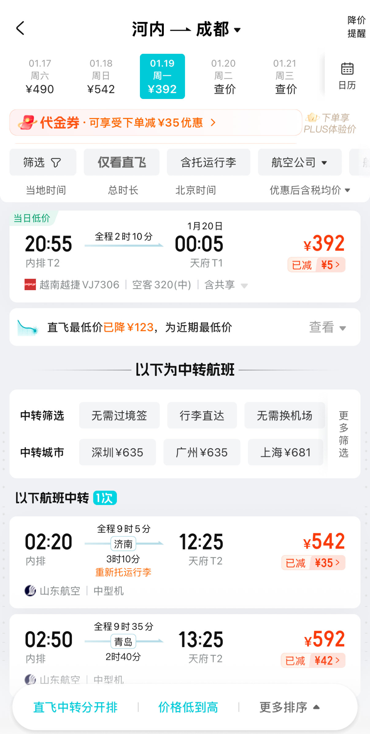 出境方面,近一个月内,从普吉岛、河内、胡志明市、曼谷至成都的航班,在大部分日期的价格约为600元。其中,1月14日从普吉岛至成都的最低价为397元,1月19日从河内至成都最低价为392元。从香港、澳门至成都的航班,大部分日期价格则在700元左右。