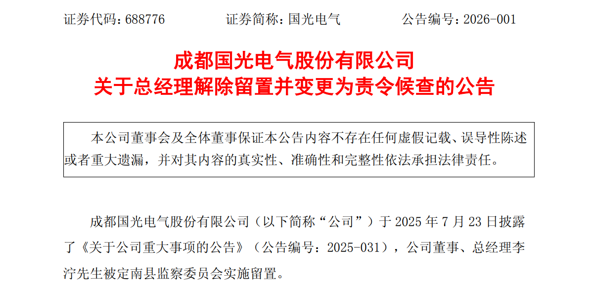 2025年7月23日,国光电气公告称,公司收到江西省赣州市定南县监委工作电话通知,公司董事、总经理李泞被实施留置。值得注意的是,此次留置持续时间超过五个月。