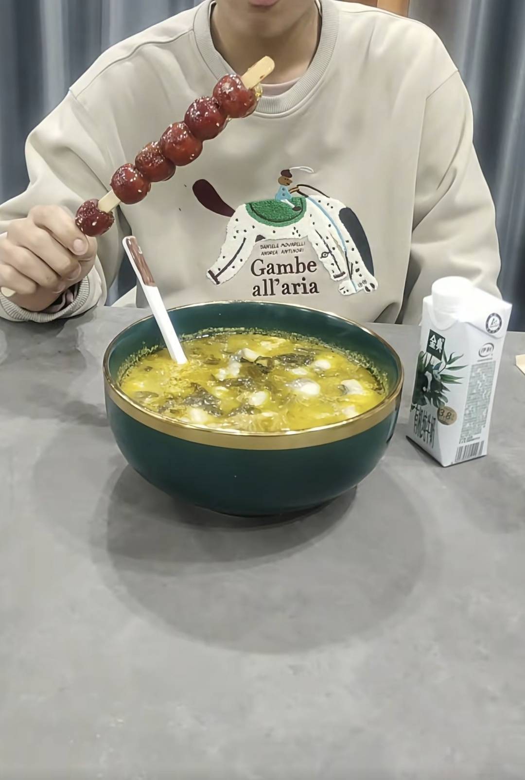 酸菜鱼搭配糖葫芦的“雷霆早餐”之一。视频截图