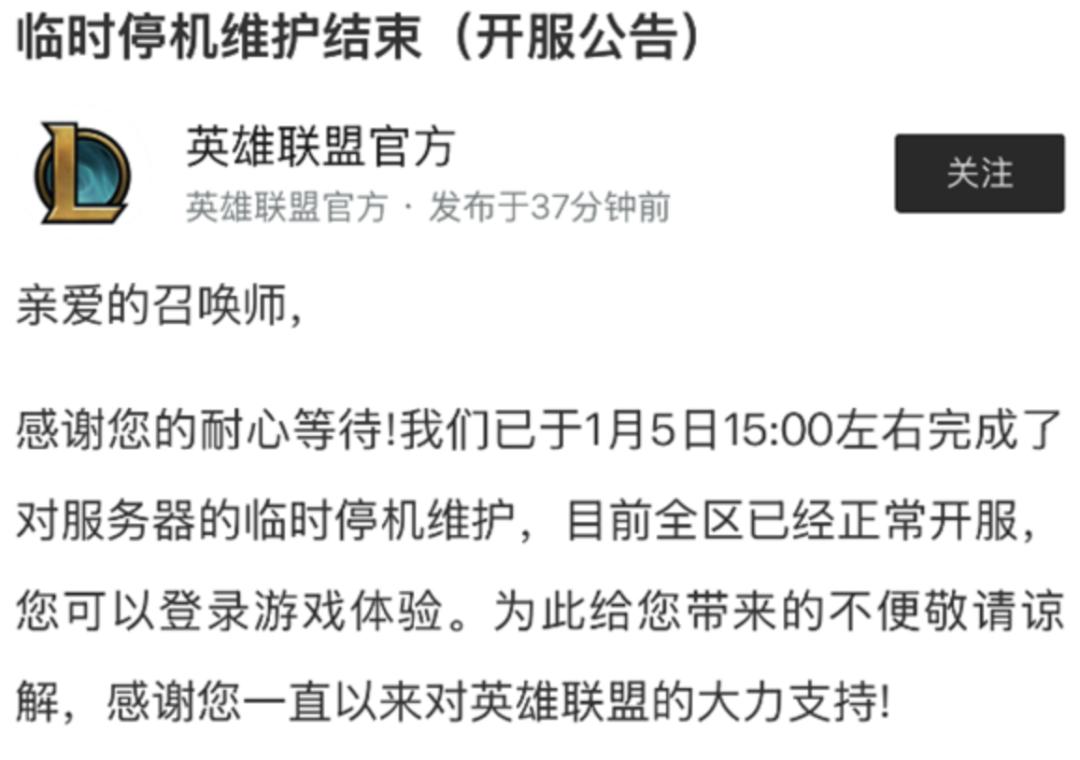15时,英雄联盟官方再发公告宣布表示,现已完成了对服务器的临时停机维护,目前全区已经正常开服。