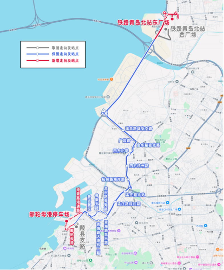 主站由铁路青岛北站西广场变更为铁路青岛北站东广场,副站由陵县支路变更为邮轮母港停车场,调整后为:铁路青岛北站东广场—邮轮母港停车场。