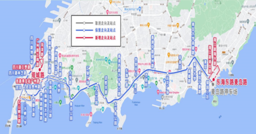 增设站:观城路(往东海东路麦岛路方向新设,往观城路方向并215路)、广州路云南路(往东海东路麦岛路方向并303路)、四川路巨野路(双向并21路)、菏泽路(往观城路方向并21路)、海口路麦岛路(往东海东路麦岛路方向并623路)、海口路海兴路(往东海东路麦岛路方向并623路)、东海东路麦岛路(上、下客站并317路)、铁路青岛站广州路(往观城路方向并325路)、红山峡支路(往观城路方向并325路)。