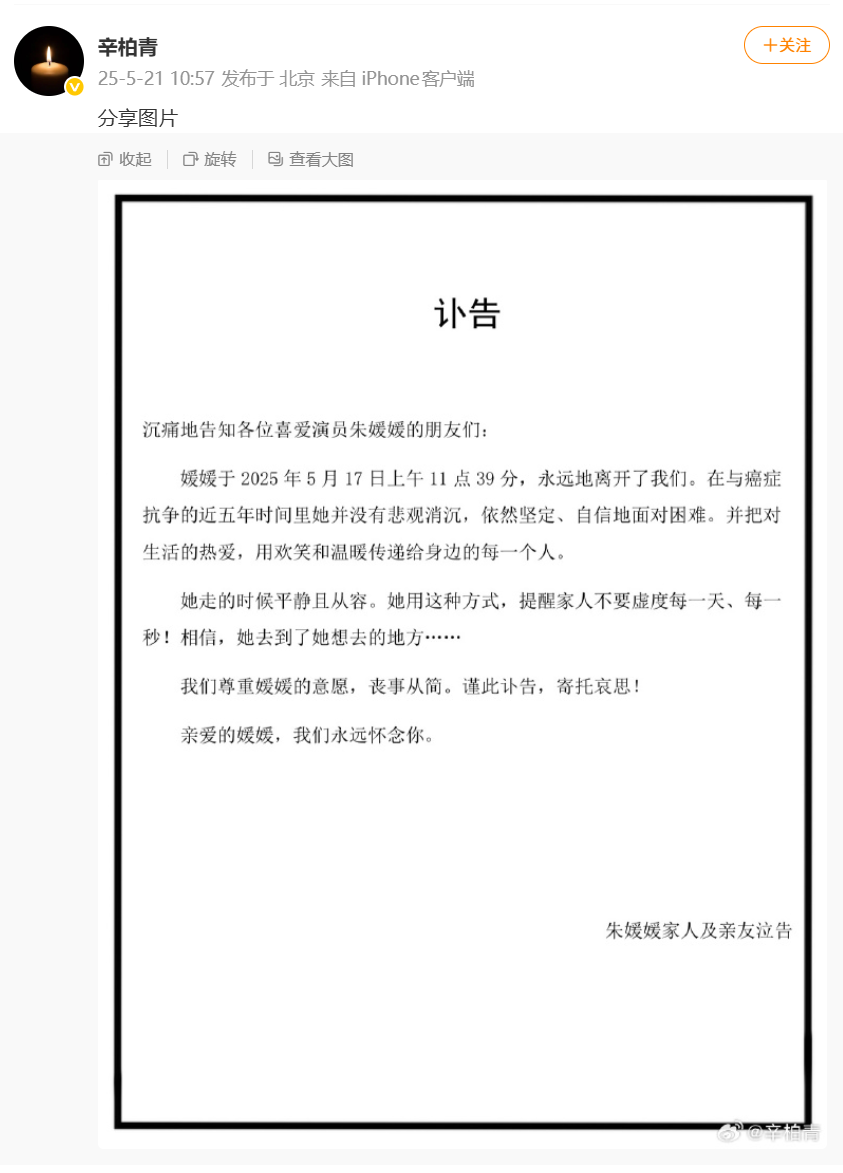 朱媛媛和丈夫辛柏青是大学同学,两人于2006年登记结婚。2025年5月21日,演员辛柏青在微博发布妻子朱媛媛去世讣告:“媛媛于2025年5月17日上午11点39分,永远地离开了我们。在与癌症抗争的近五年时间里她并没有悲观消沉,依然坚定、自信地面对困难。并把对生活的热爱,用欢笑和温暖传递给身边的每一个人。”辛柏青透露妻子走的时候“平静且从容”,尊重妻子的意愿,丧事从简,并称“永远怀念你” 。