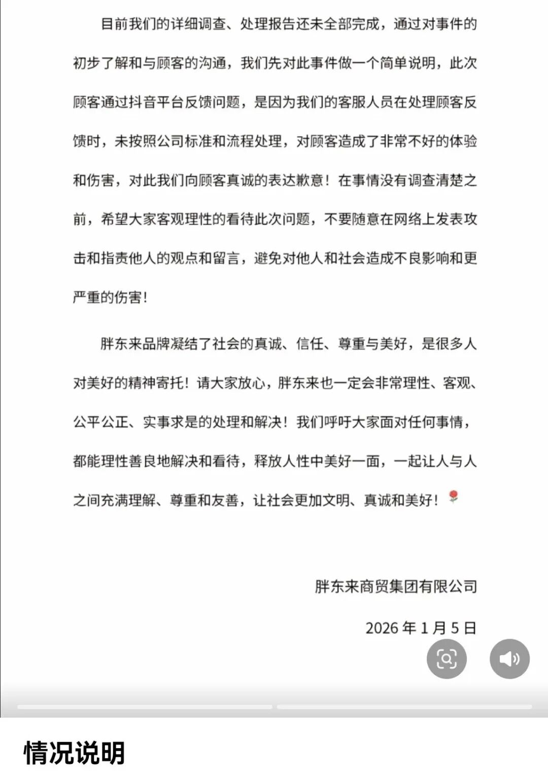 目前我们的详细调查、处理报告还未全部完成,通过对事件的初步了解和与顾客的沟通,我们先对此事件做一个简单说明,此次顾客通过抖音平台反馈问题,是因为我们的客服人员在处理顾客反馈时,未按照公司标准和流程处理,对顾客造成了非常不好的体验和伤害,对此我们向顾客真诚地表达歉意!在事情没有调查清楚之前,希望大家客观理性地看待此次问题,不要随意在网络上发表攻击和指责他人的观点和留言,避免对他人和社会造成不良影响和更严重的伤害!