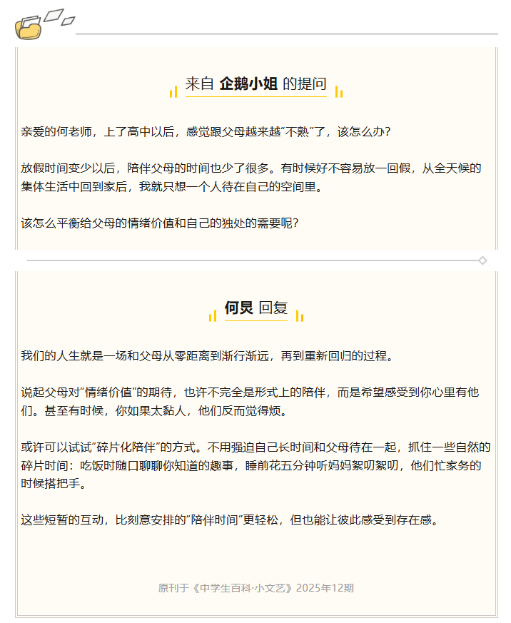 据悉,《中学生百科》杂志的“快乐如何”栏目是何炅专栏,从1999年开始,何炅在这个栏目就读者提问每周解答一个问题。1999-2025年,26年,是何老师用文字织就的温柔铠甲,陪着一代又一代中学生走过迷茫与成长。专栏虽落幕,但那些藏在字里行间的温暖与力量,会一直留在青春里。