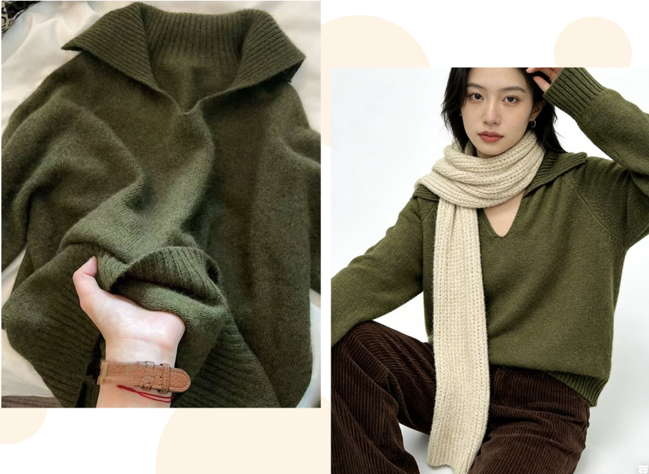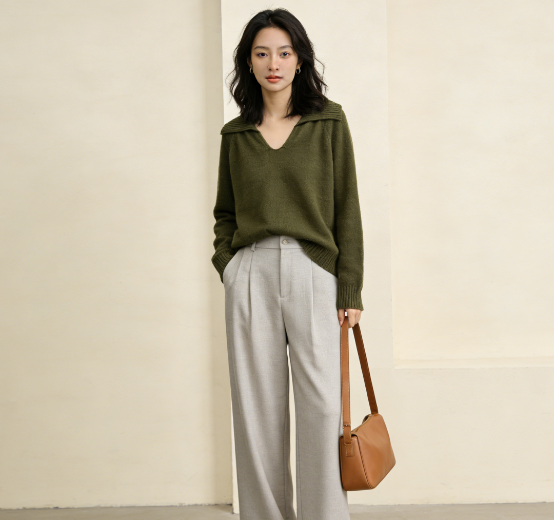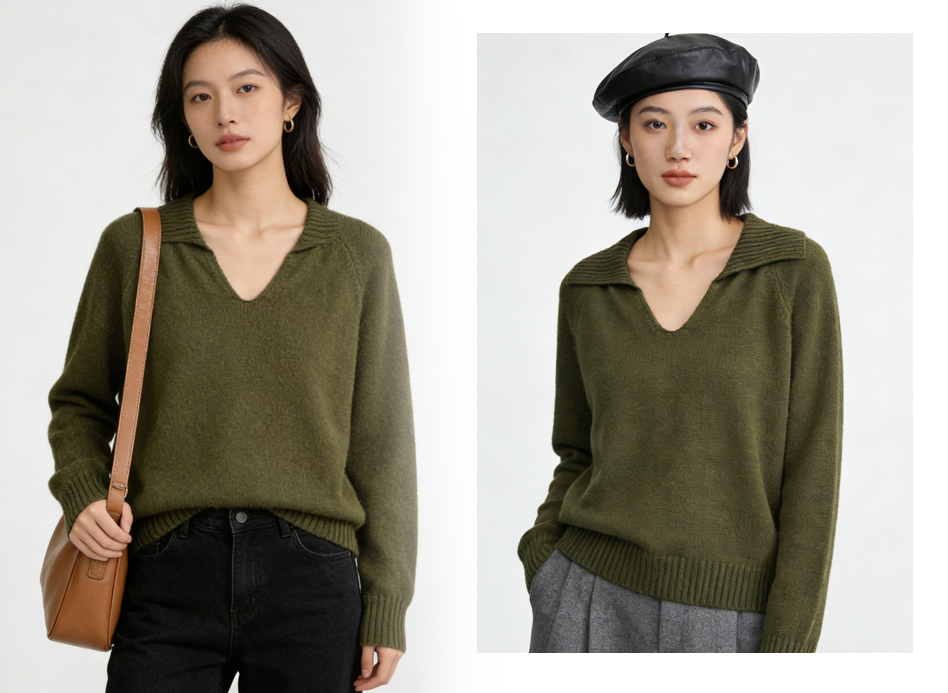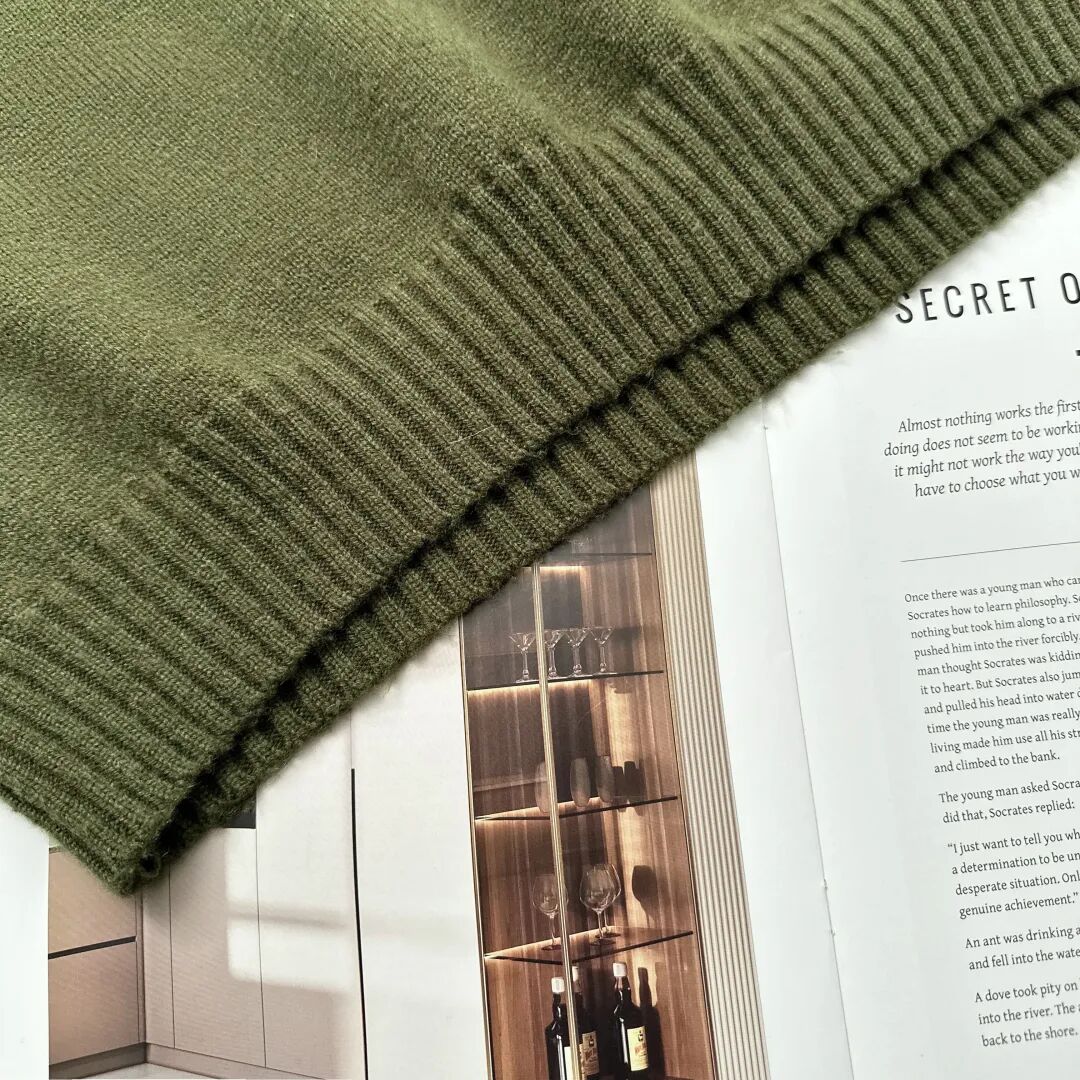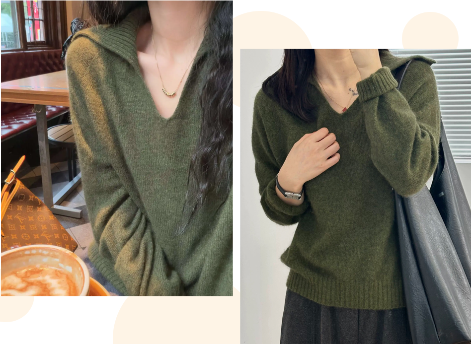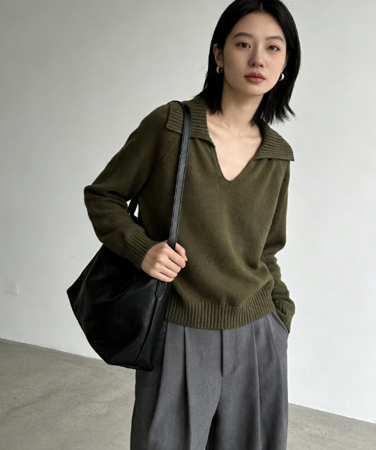 宽松而慵懒的V领,柔软亲肤的触感,克什米尔绿不张扬,却自带故事感。