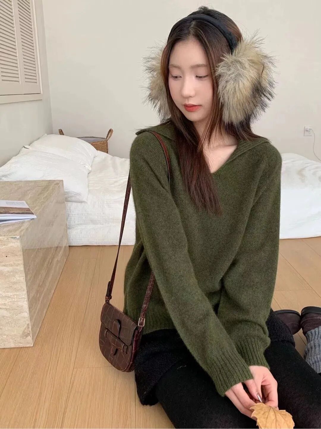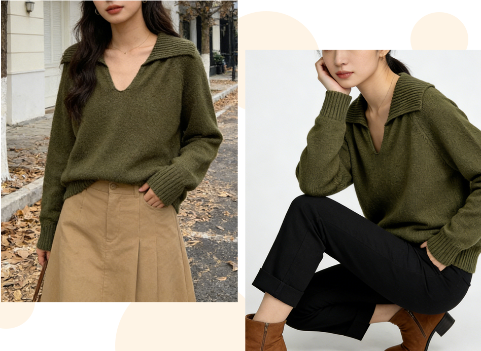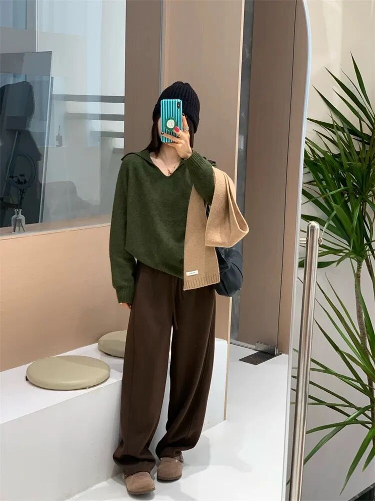 版型是慵懒挂的松弛感,Polo领+V字挖空的组合太妙,翻领修饰肩颈线条,小V领刚好露出锁骨弧度,削弱了毛衣的臃肿感。